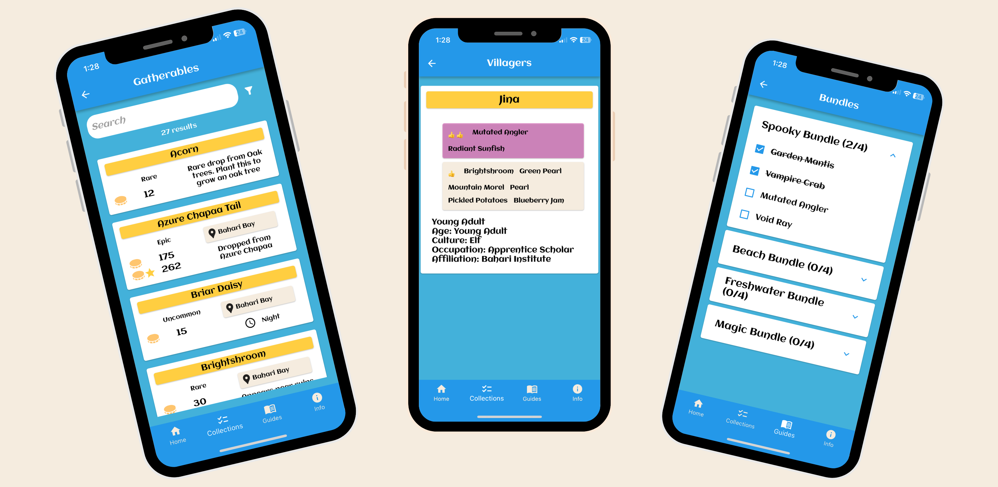 The collections tab includes info about many aspects of the games including gatherables, fish, bugs, materials, crops, cooking recipies and more!